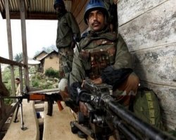An Indian soldier serving with the UN's MONUSCO peacekeeping mission guards the Congolese village of Luvungi on September 4, 2010.